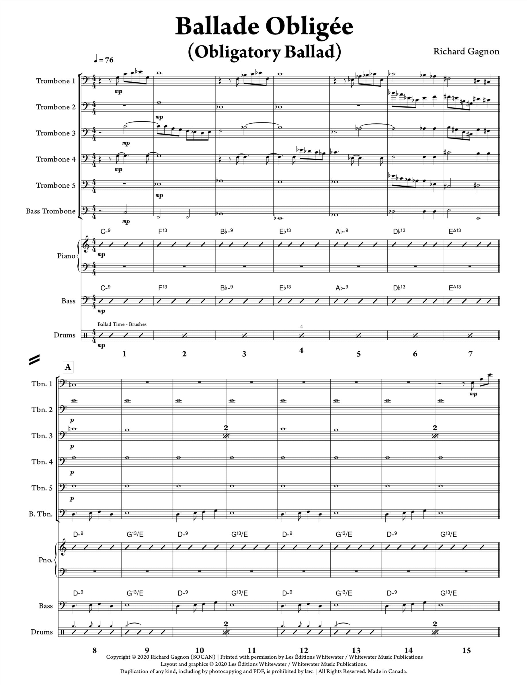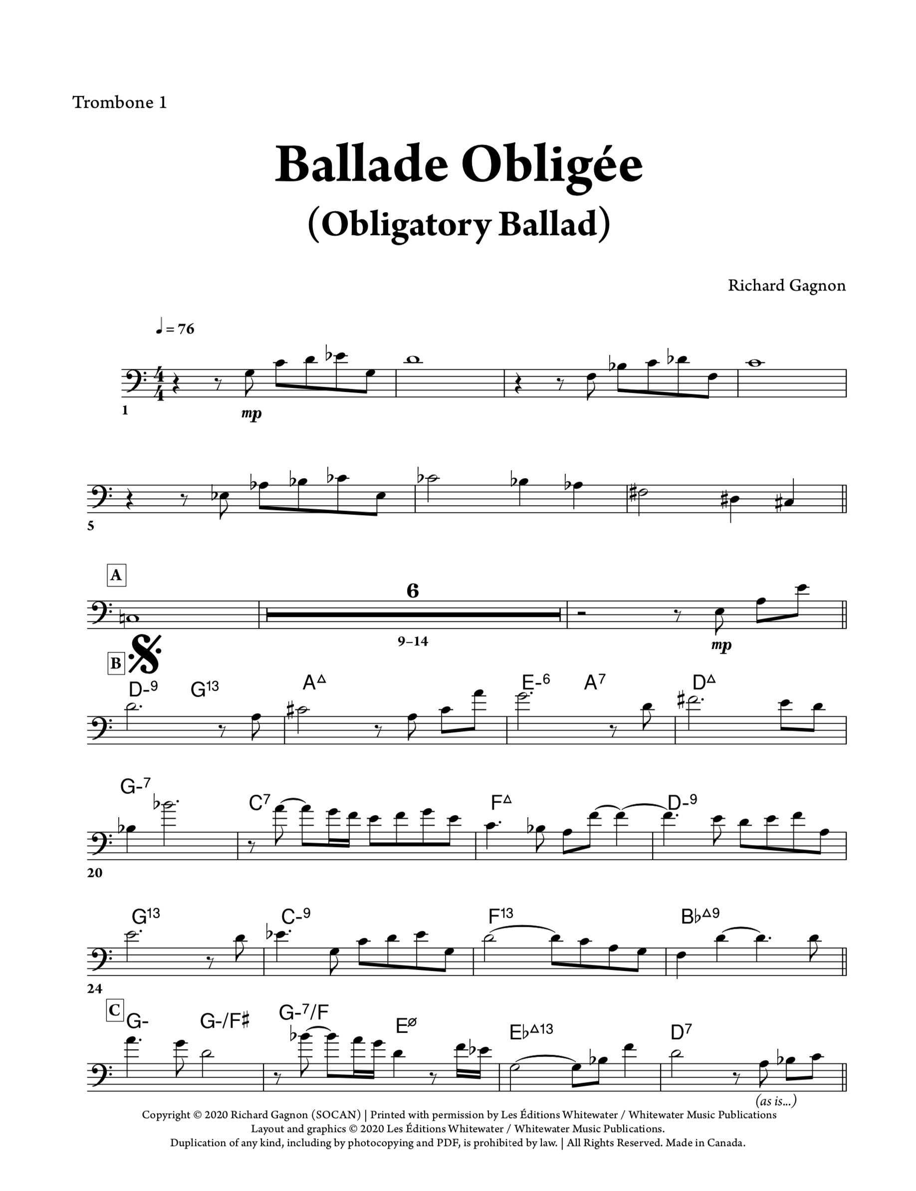 Richard Gagnon a peut-être nommé cette composition «Ballade Obligée», mais il n'y a certainement rien de superficiel ou d'insouciant dans cette composition. Une belle mélodie et harmonisation, cette pièce mettent le son mélodieux du trombone en avant. Les tessitures sont raisonnables pour tout l'ensemble, et celui-ci pourrait être joué comme écrit (avec 1 chorus et un demi-chorus de l'improvisation), ouvert comme vous le souhaitez, ou même joué sans improvisation.