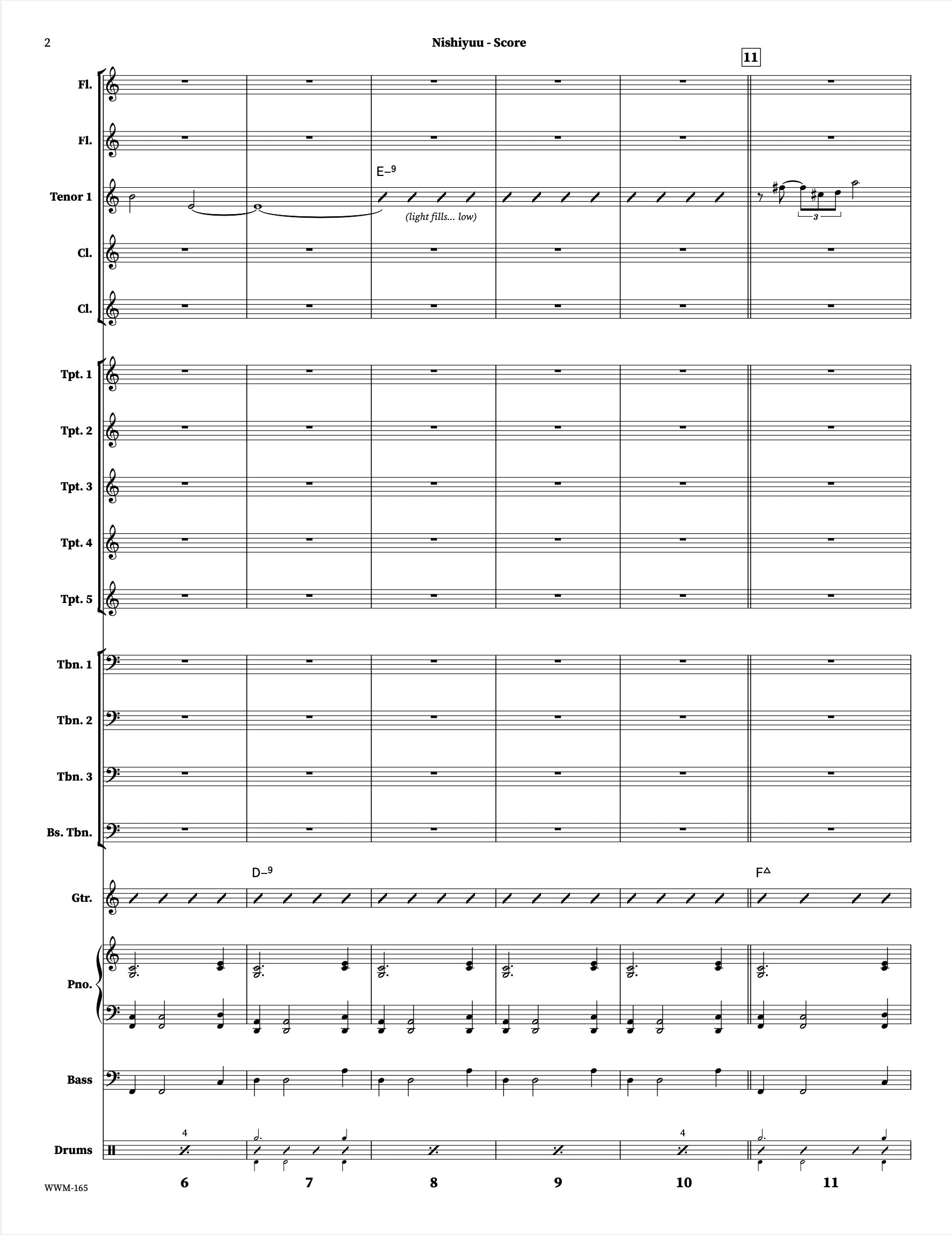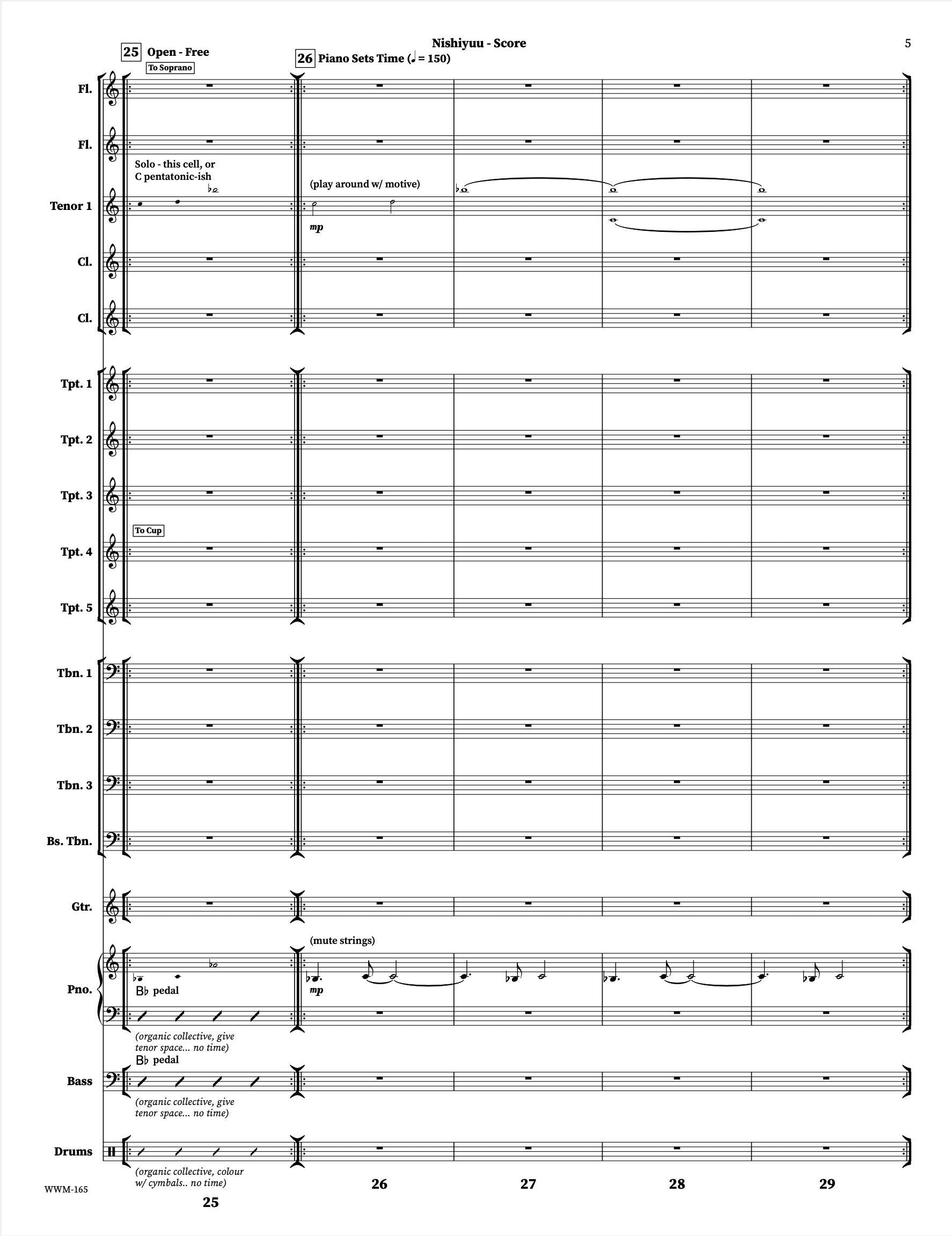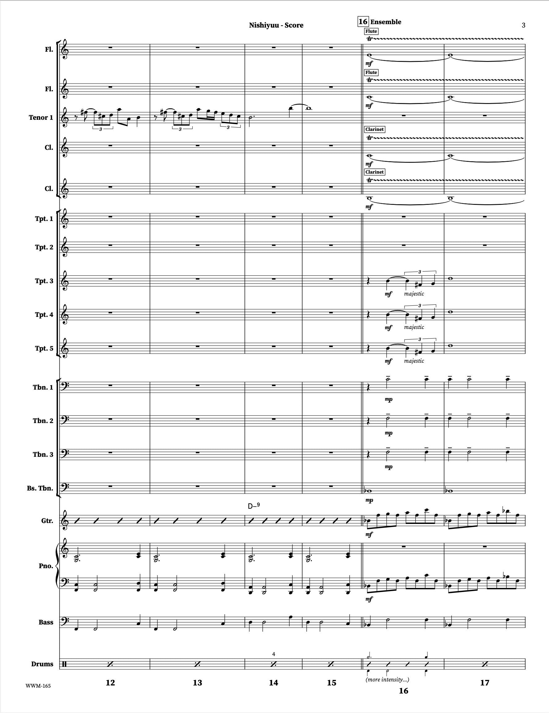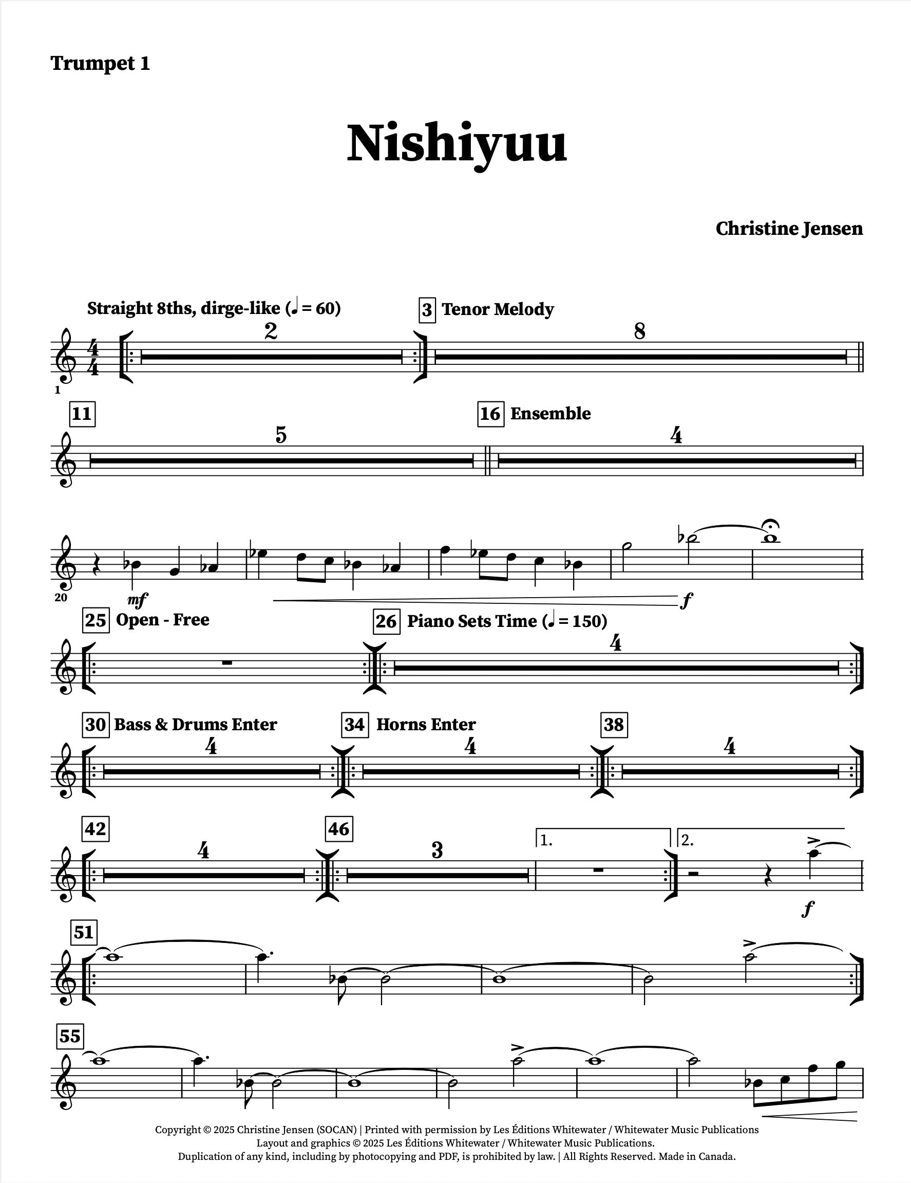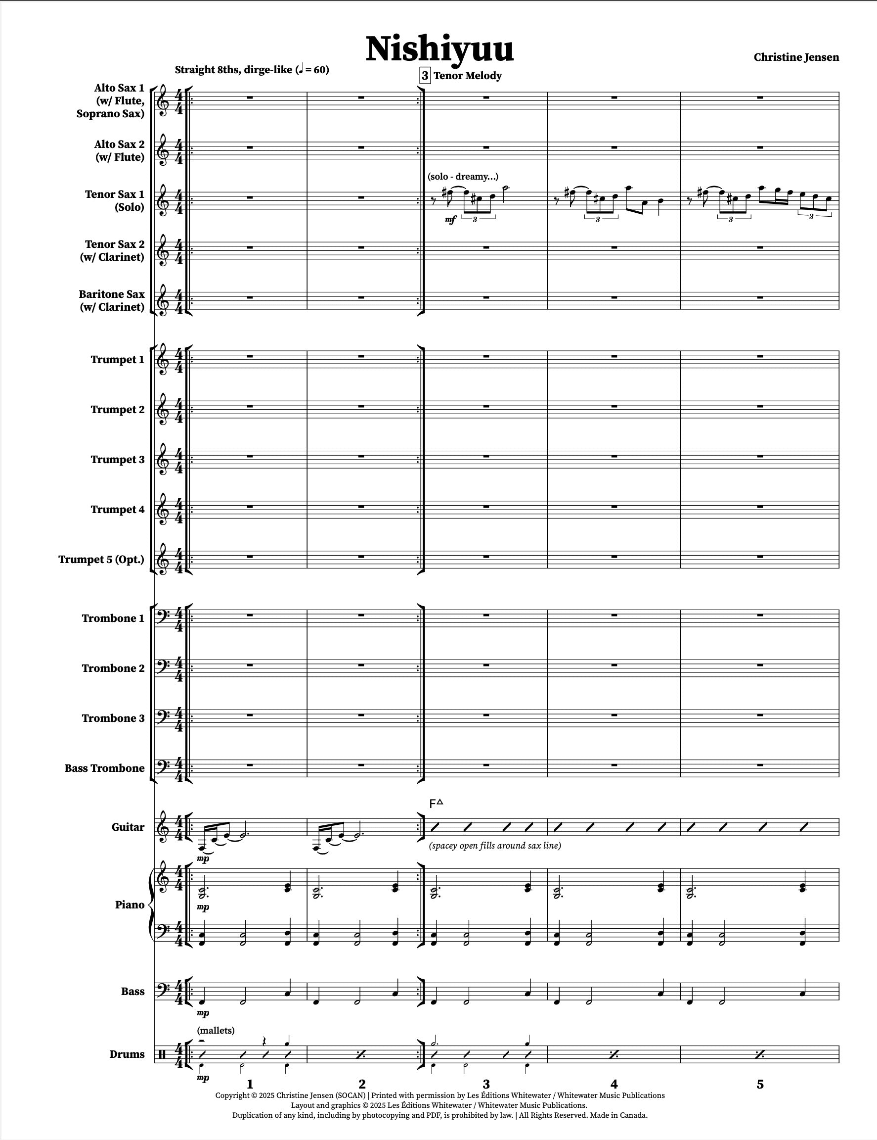 Nishiyuu est une magnifique œuvre de longue durée qui met en vedette le premier sax ténor comme soliste. Exactement comme enregistré par le Christine Jensen Jazz Orchestra sur l'album « Habitat » (2013) avec Chet Doxas. Défi musical et créatif pour l'orchestre, les tessitures des cuivres sont assez raisonnables tout au long de l'œuvre. Cette pièce serait un ajout merveilleux à un programme de concert.