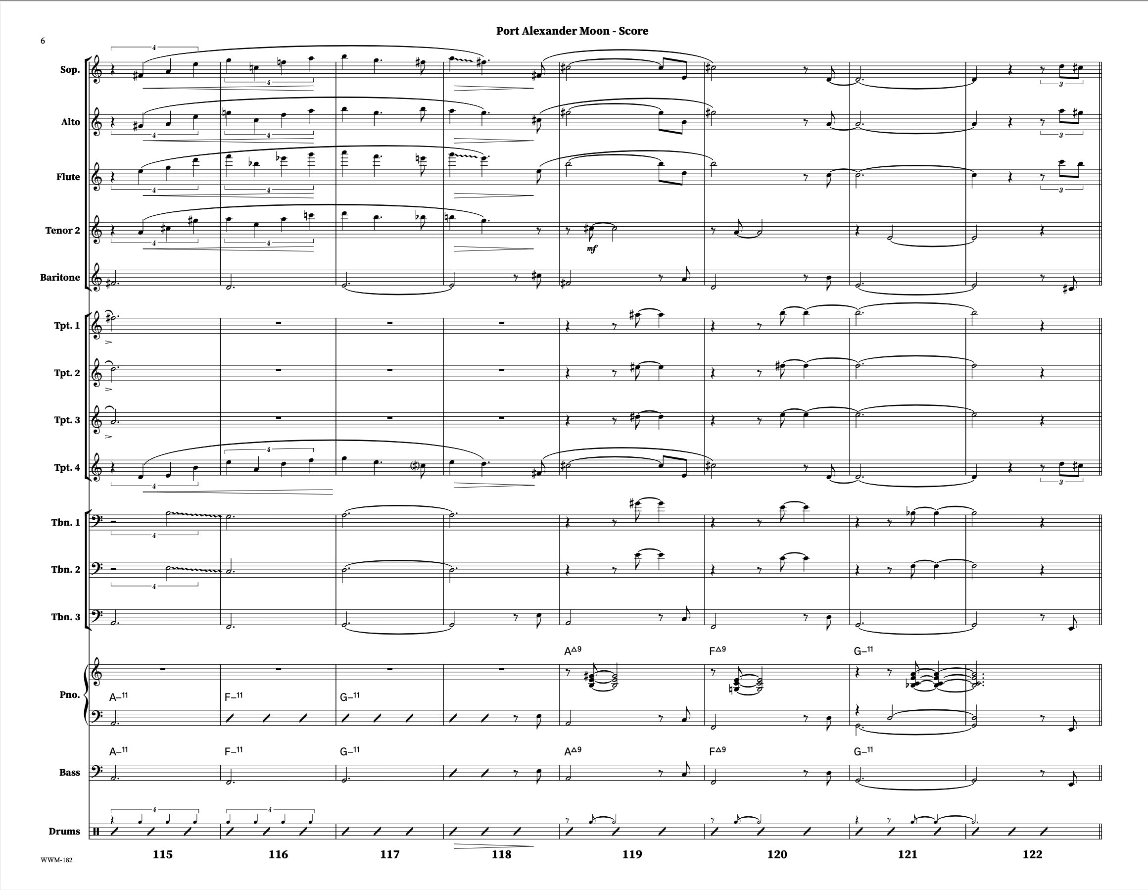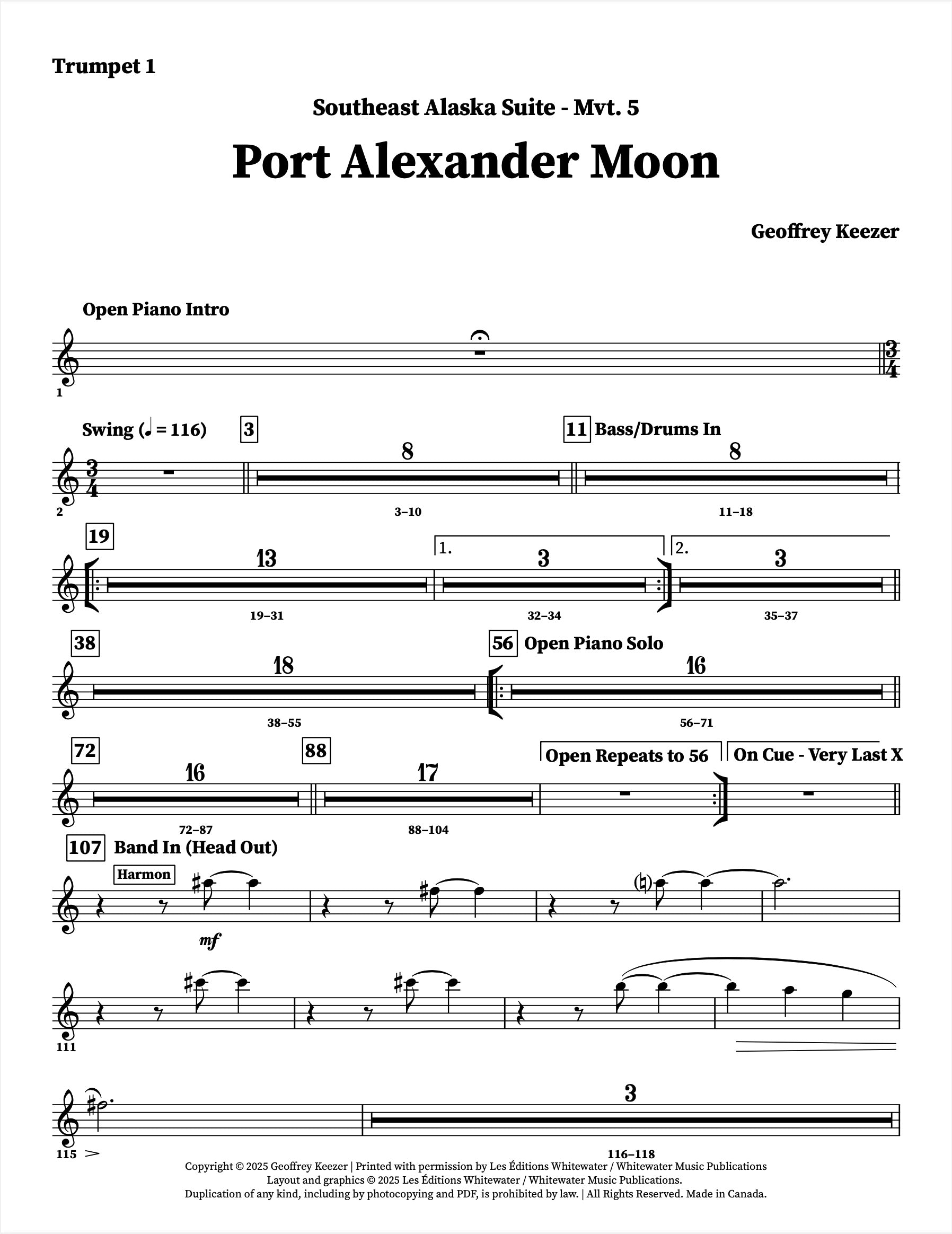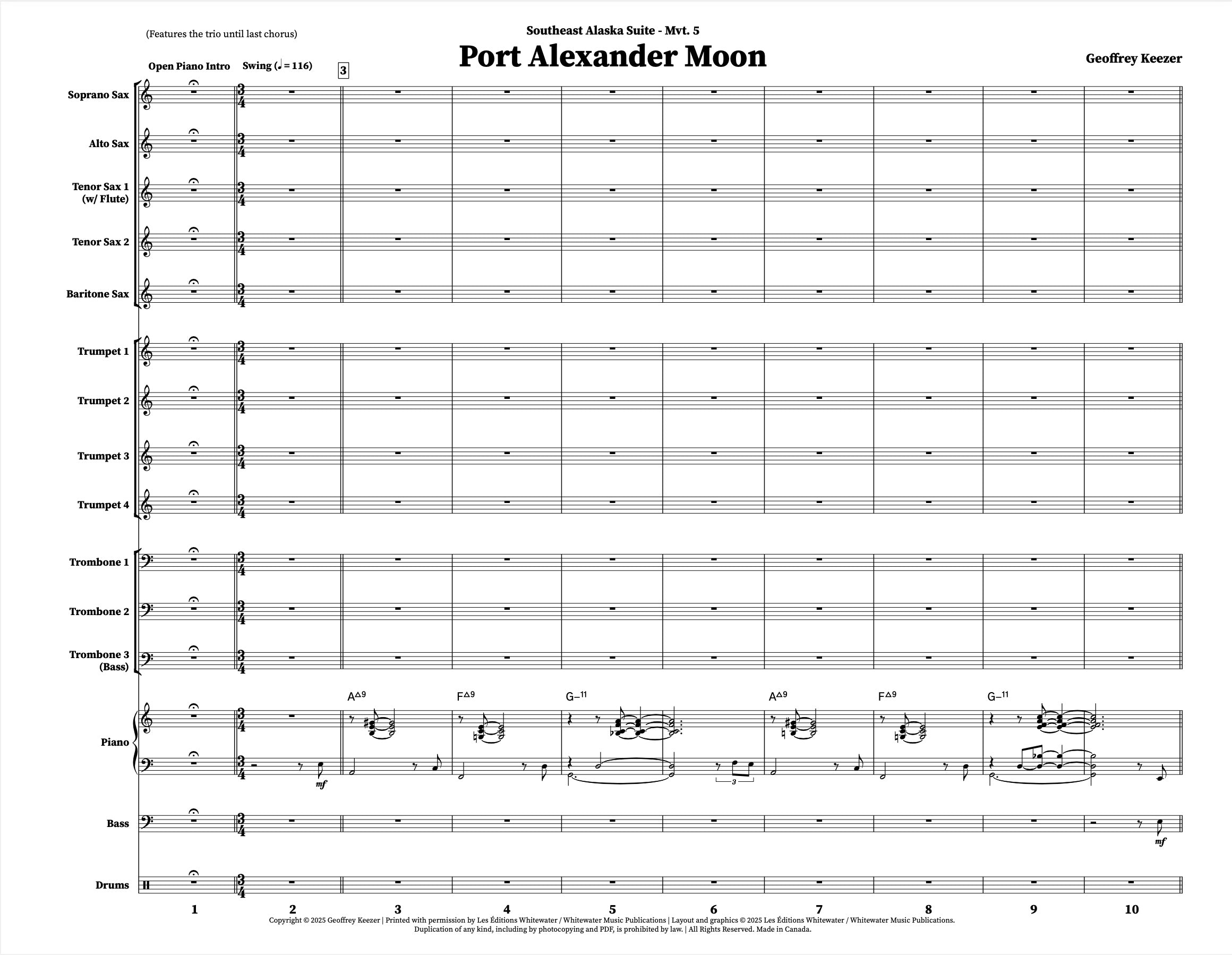 La « Southeast Alaska Suite » de Geoffrey Keezer est une œuvre exceptionnelle en sept mouvements, commandée par le Scottish National Jazz Orchestra en 2005. Ce cinquième mouvement, « Port Alexander Moon », met le trio de musiciens de la section rythmique en vedette jusqu'au dernier chorus.