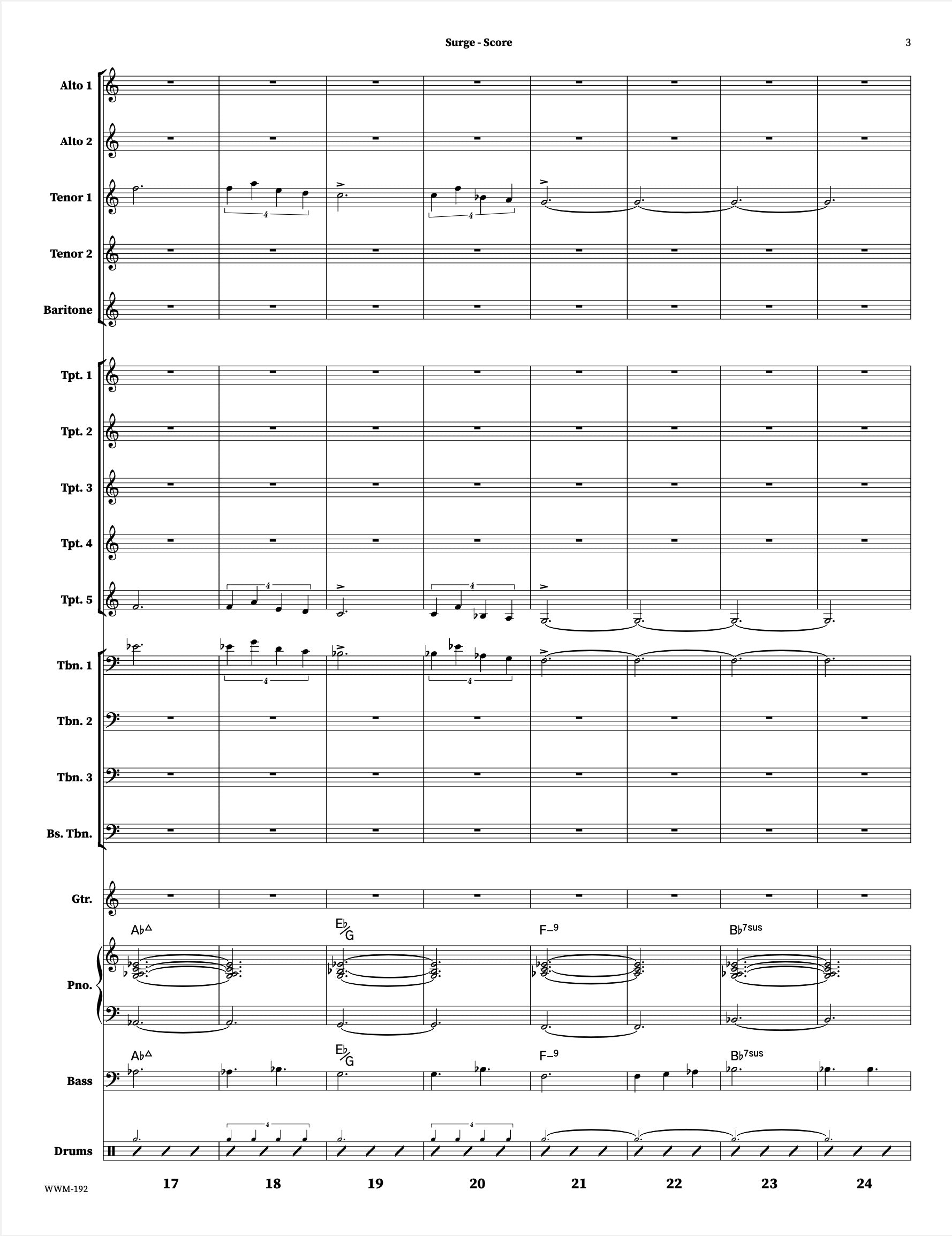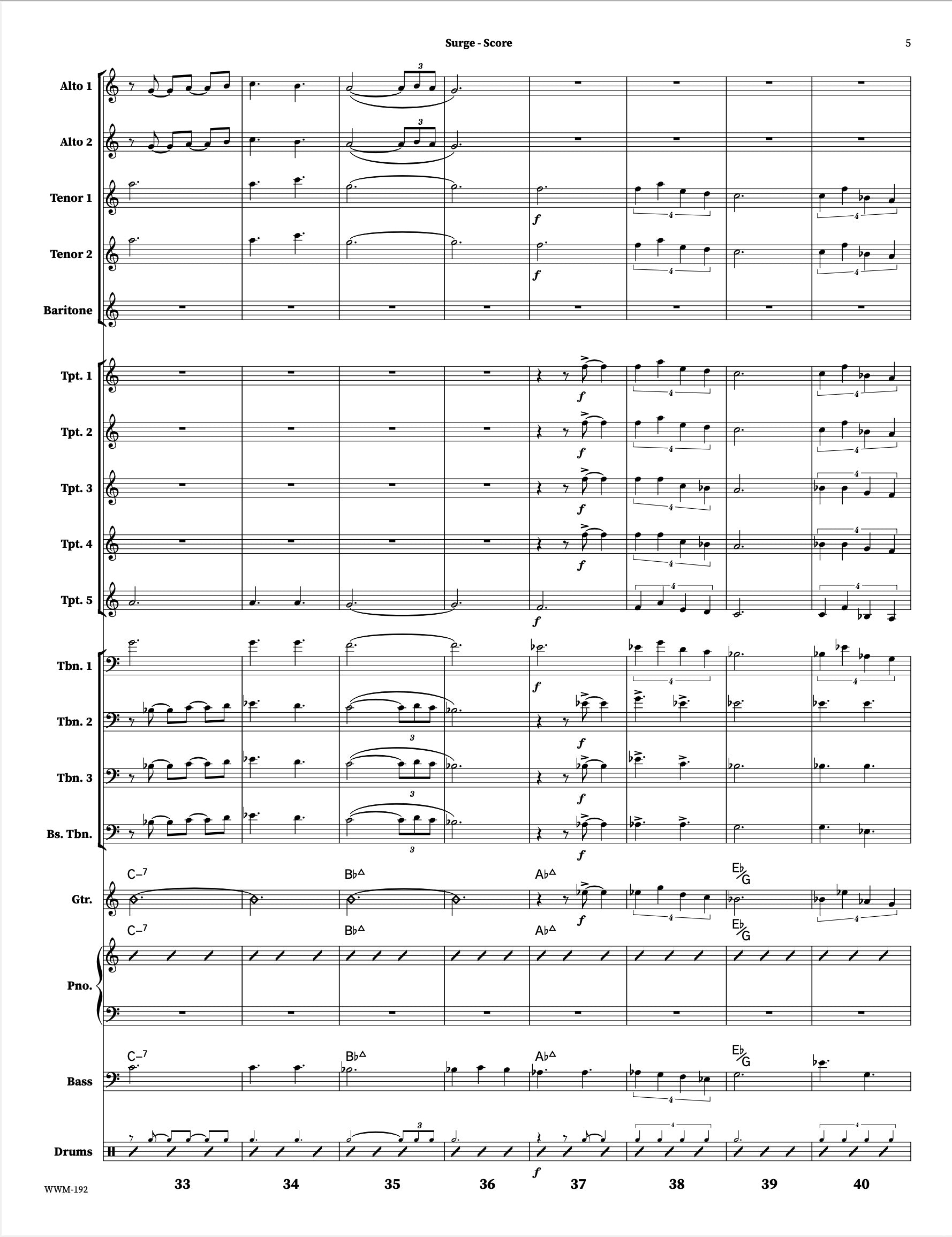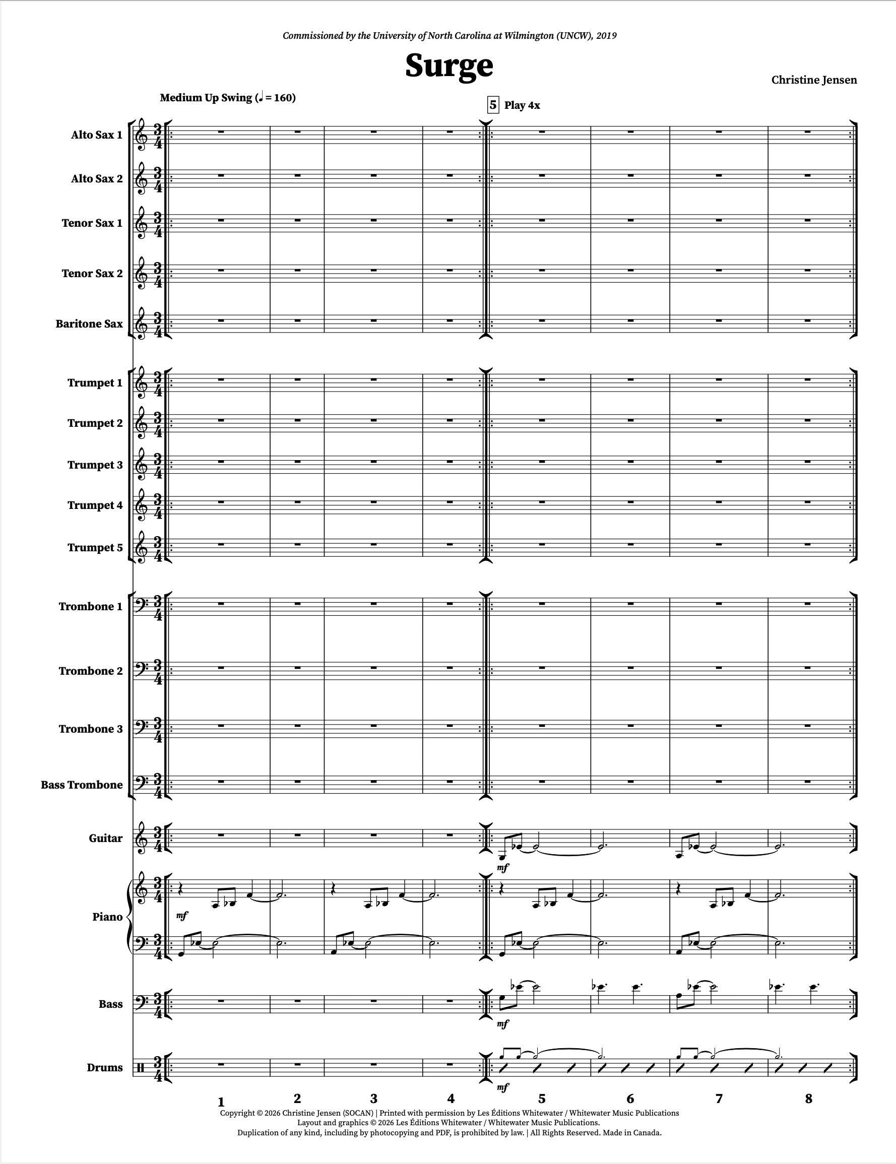 Surge begins as a beautiful, gentle waltz with solo space for the piano and trumpet, and moves to 4/4 gospel swing to feature the alto saxophone. As recorded by the Christine Jensen Jazz Orchestra on "Harbour" (2024).